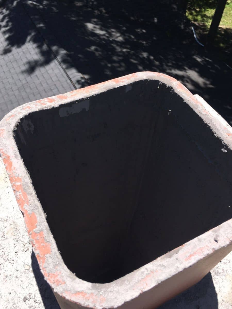 A brick chimney with loose rocks on top, a metal cap, a black trash bag, and an orange bucket nearby.