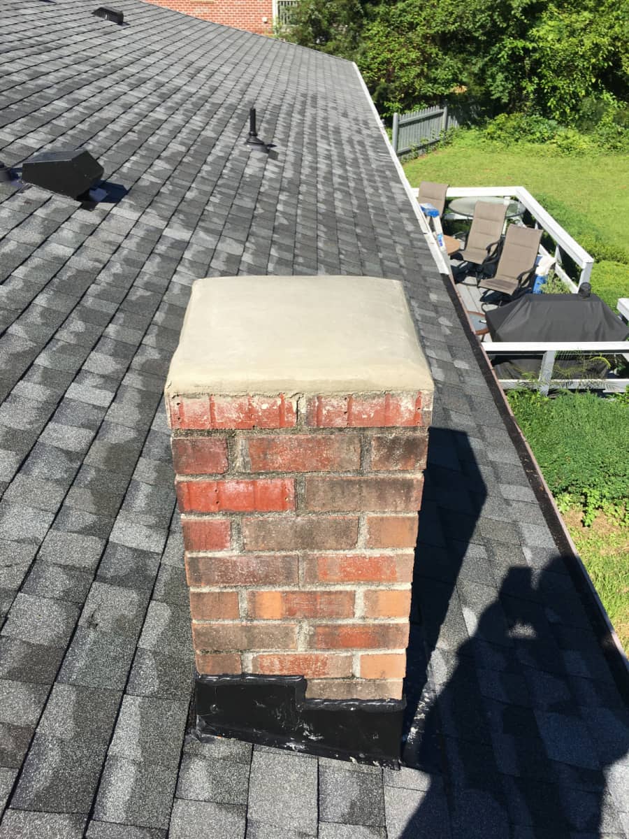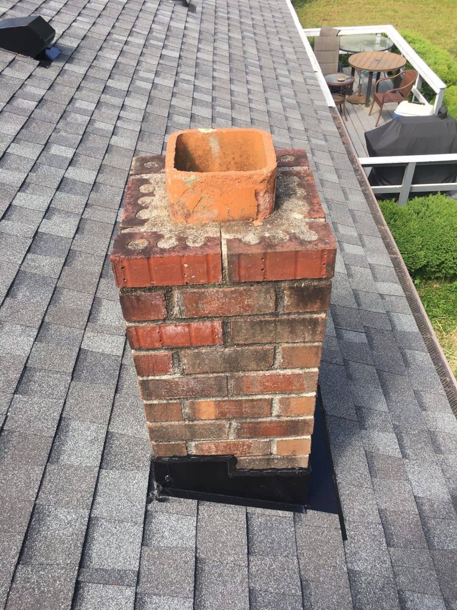 A red brick chimney on a gray shingled roof, viewed from above, with a patio visible in the background.