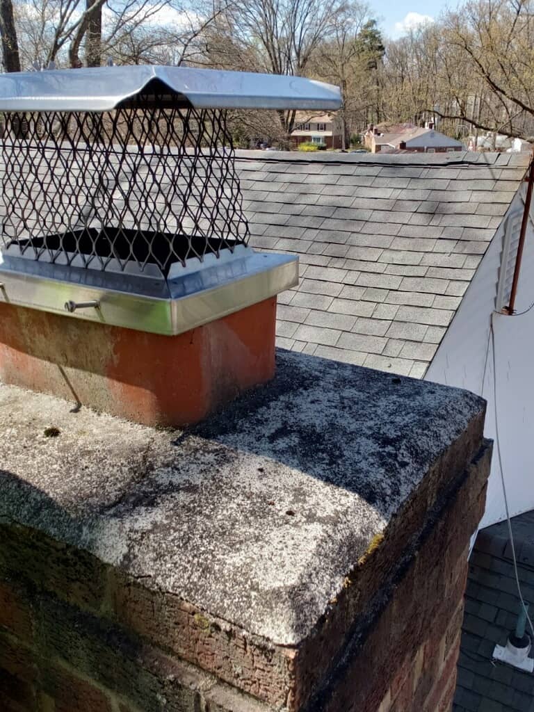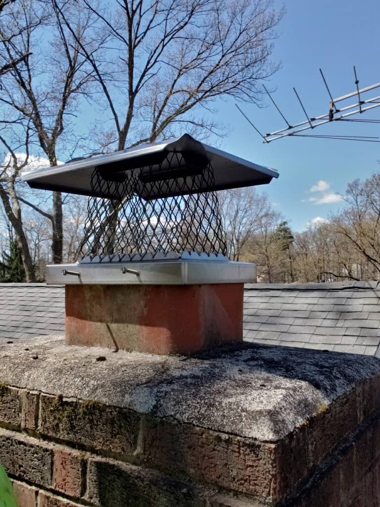 A chimney cap with a mesh cover sits atop a brick chimney on a roof, with trees in the background.