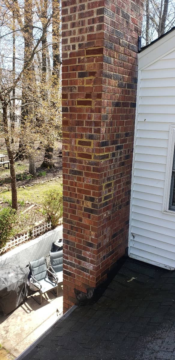 A brick chimney with a highlighted area showing spalling bricks that need replacement.