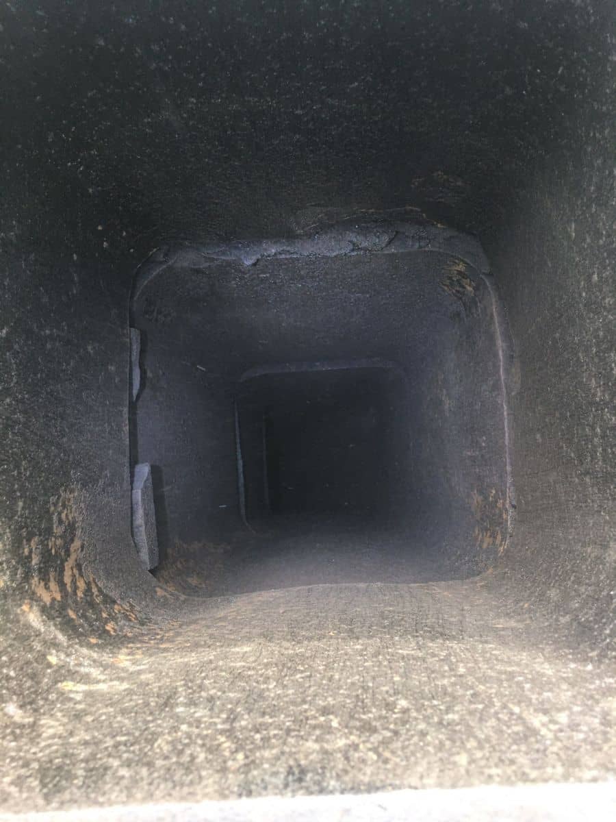 A view inside a dusty, rectangular chimney or vent shaft with light and shadows on the interior walls.