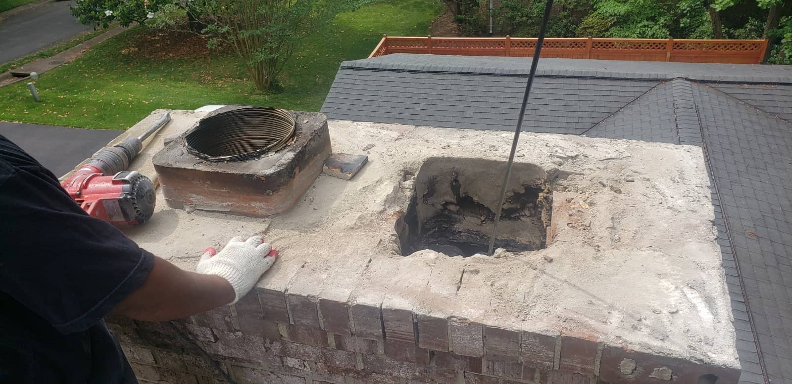 A brick chimney with loose debris on top, viewed from a rooftop next to a suburban street and yard.