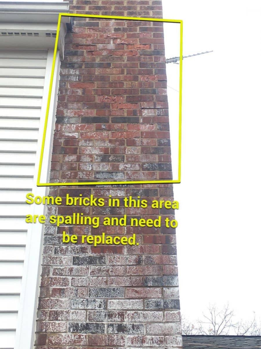 A brick chimney with a yellow box highlighting damaged bricks; text notes spalling bricks need replacement.