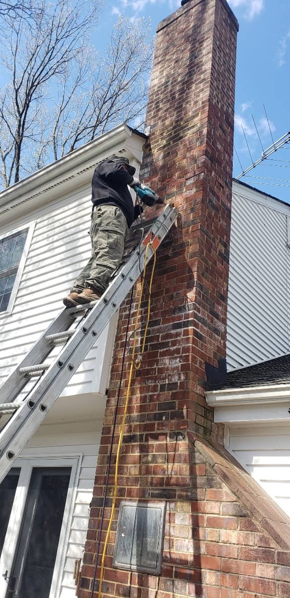 A person cleans a brick chimney on a rooftop, with tools and a removed cap visible.