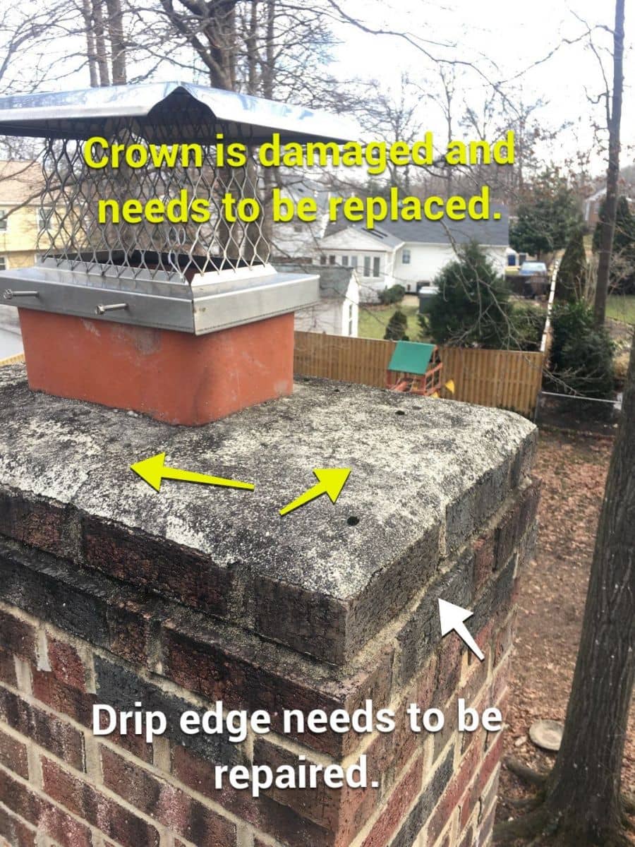 Chimney with a damaged crown and drip edge, both indicated by arrows and text needing repair.