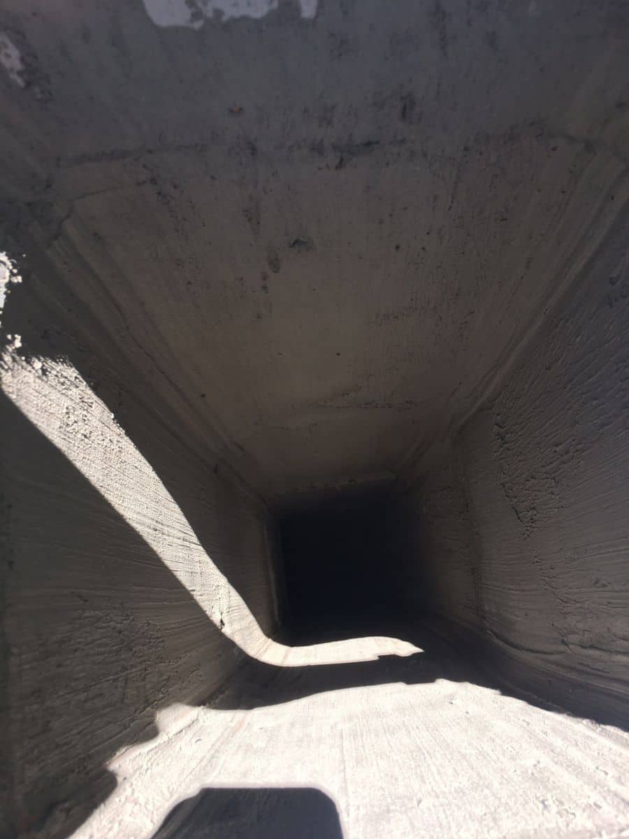 View looking down a dark, square ventilation shaft or duct with rough, dirty inner walls.